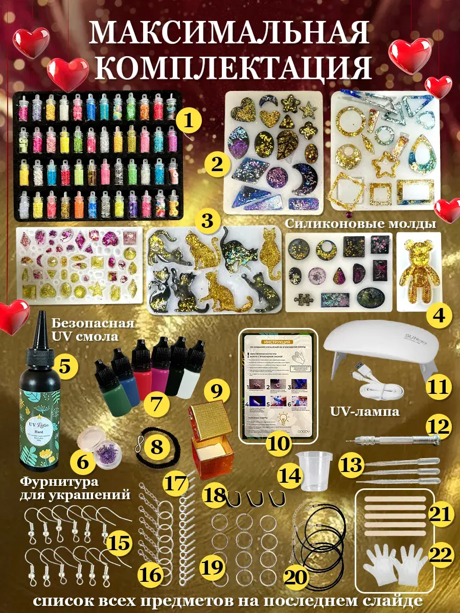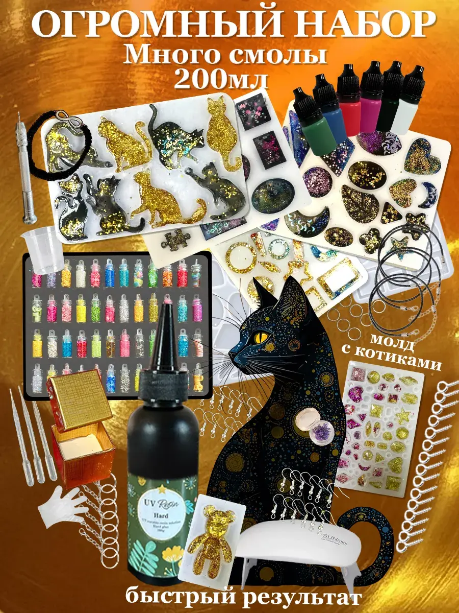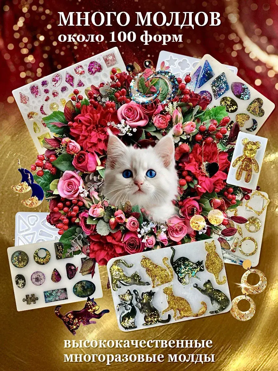 Подарите ребенку волшебный мир творчества для создания украшений из эпоксидной смолы! Это идеальный подарок для девочек 5-6, 7-8 и 9-10 лет, а также увлекательное хобби для взрослых. В продуманной максимальной комплектации детского набора есть всё на любой вкус : однокомпонентная безопасная смола без запаха, яркие красители, формы с милыми котиками, мишкой, сердечками, а также аксессуары для создания брелков, подвесок, сережек и других украшений.